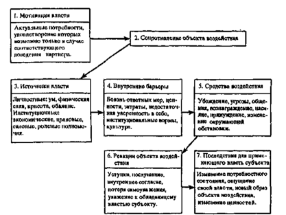 Выбор источников власти зависит от желаний и потребностей объекта, подвергающегося воздействию, а также от вида поведения, к которому субъект хочет его склонить. Но, выбрав надлежащий источник власти, субъект чаще всего испытывает сомнения в успешности его применения. Это может выражаться в неуверенности в своих силах, боязни потерять свое "Я" и т.д. (п. 4 рис. 5). Субъекту власти далеко не всегда удается преодолеть барьер недостаточной уверенности в себе. В том случае если барьер не возникает или успешно преодолевается, субъект начинает применять средства воздействия, которые "отчасти отвечают избранному источнику власти, отчасти зависят от индивидуальных особенностей использующего власть, от его восприятия ситуации и от оказываемого сопротивления" (115, т. 1, с. 285). На рис. 5 этот момент помечен как п. 5. В зависимости от ситуации субъект власти обычно использует институциональные средства, которые являются более жесткими, чем личностные.