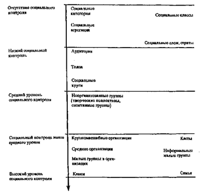 циях социальный контроль отсутствует, так как это чисто абстрактные выделения сообществ по одному признаку. Конечно, у индивидов, входящих в категорию, можно заметить определенную идентификацию с другими членами категории (например, по возрасту), но, повторяем, социальный контроль практически здесь отсутствует. Весьма низкий уровень контроля наблюдается в общностях, сформированных по принципу пространственной близости. Социальный контроль здесь происходит просто из сознания присутствия других индивидов. Затем социальный контроль усиливается по мере превращения квазигрупп в социальные группы.