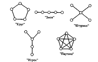 Влияние различных способов коммуникаций на деятельность группы было изучено А. Бавеласом (151, с. 95-96). Он рассматривал итоги деятельности групп из пяти членов при различных способах коммуникации, которые он назвал так: "круг", "змея", "штурвал", "игрек", "паутина".