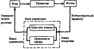 рения информация о параметрах выхода поступает в блок управления, где они сравниваются с некоторым эталоном (это может быть программа или план), после чего вырабатывается управленческое решение, которое изменяет входные параметры, режим деятельности процессора и в конечном счете параметры выхода. Затем выходные параметры опять замеряются и процесс повторяется. Эта схема применима для всех систем - и технических и социальных. Поэтому справедливо рассмотреть социальную организацию с точки зрения проявления специфических характеристик управления.