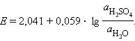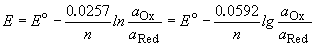 где aOx и aRed - активности окисленной и восстановленной форм вещества, участвующего в полуреакции; Eo - стандартный потенциал электрода (при aOx = aRed =1); n - число электронов, участвующих в полуреакции; R - газовая постоянная; T - абсолютная температура; F - постоянная Фарадея. При 25o C