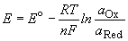,где aOx и aRed - активности окисленной и восстановленной форм вещества, участвующего в полуреакции; Eo - стандартный потенциал электрода (при aOx = aRed =1); n - число электронов, участвующих в полуреакции; R - газовая постоянная; T - абсолютная температура; F - постоянная Фарадея. При 25o C