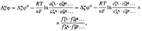 где DMpj0-постоянная, R-газовая постоянная, Т-т-ра, F-постоянная Фарадея, сi, ai, fi-соотв. концентрации, активности и коэф. активности реагентов. Поскольку абс. значения гальвани-потенциала невозможно определить, часто приводится аналогичное выражение для потенциала электрода относительно определенного электрода сравнения: