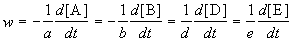 где квадратные скобки обозначают концентрацию вещества (обычно измеряется в моль/л), t - время; a, b, d, e - стехиометрические коэффициенты в уравнении реакции.