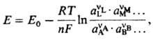 где А, В, ..., L, М, ...-реагенты, vA, vB, ..., vL, vM, ...-их стехиометрич. коэф., "-число электронов, участвующих в р-ции. Для гальвани-потенциала электрода (см. Межфазные скачки потенциала)Нернста уравнение записывается в виде: