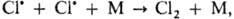 где М-третья частица. Суммарный порядок таких р-ций-третий (скорость u = = k[М][Сl]2, где k-константа скорости), но молекуляр-ность равна 2, т.к. в хим. взаимодействии участвуют два атома хлора, а частица М лишь принимает на себя энергию, выделившуюся при рекомбинации атомов, не претерпевая при этом хим. превращения.