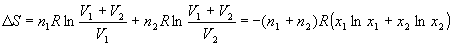 Если n1 молей одного газа, занимающего объем V1, смешиваются с n2 молями другого газа, занимающего объем V2, то общий объем будет равен V1 + V2, причем газы расширяются независимо друг от друга и общее изменение S равно сумме изменений S каждого газа: