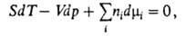 где S и V-энтропия и объем системы соотв., ni-число молей i-того компонента. Для процессов, происходящих при постоянных Т и р, Гиббса - Дюгема уравнение устанавливает связь между изменениями хим. потенциалов компонентов и Наиб. широко используется в термодинамике р-ров. Для р-ров неэлектролитов употребительны след. формы ур-ния: