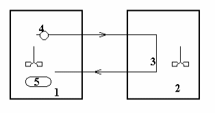 Рис. 1. Схема экспериментальной установки. 1, 2 - теплоизолированные емкости (термостаты), снабженные мешалкой. Циркуляционный контур, включающий змеевик 3 и насос 4. Нагреватель - 5.
