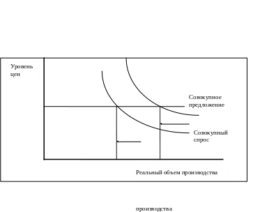 Кейнсианская модель макроэкономического равновесия графически представлена на рис.2. Кривая совокупного предложения в этой модели горизонтальная, поскольку цены неэластичны. Так как совокупный спрос изменчив, то реальный объем производства может снижаться.