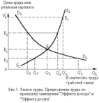 Дилемма "работа-досуг" применительно к рынку труда получила название "эффект замещения" и "эффект дохода", который можно увидеть на рис.1 по своеобразному наклону полого поднимающейся кривой предложения труда (SL). Характерный наклон кривой предложения труда в сторону оси PL показывает, что повышающаяся заработная плата стимулирует работника к труду лишь до определенного момента (точка E1).