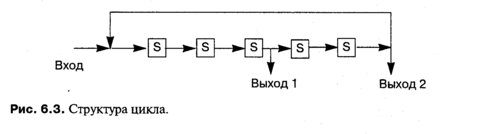 Операторы цикла наиболее трудны для программирования: в них легко сделать ошибку, особенно на границах цикла, то есть при первом и последнем выполнении тела цикла. Кроме того, неэффективная программа чаще всего расходует большую часть времени в циклах, поэтому так важно понимать их реализацию. Структура цикла показана на рис. 6.3. Оператор цикла имеет точку входа, последовательность операторов, которые составляют цикл, и одну