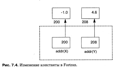 У подпрограммы два параметра типа Real. Поскольку используется семантика ссылки, Sub получает указатели на два фактических параметра, и присваивание выполняется непосредственно для фактических параметров (см. рис. 7.4). В результате область памяти, где хранится значение -1,0, изменяется! Без преувеличения можно сказать, что выявить и устранить эту ошибку буквально