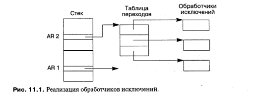 Реализуются обработчики исключений очень эффективно. Процедура, которая содержит обработчики исключений, имеет дополнительное поле в записи активации с указателем на обработчики (см. рис. 11.1). Требуется только одна команда при вызове процедуры, чтобы установить это поле, вот и все издержки при отсутствии исключений.