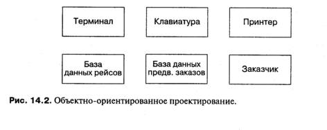 Такие внешние устройства, как дисплейный терминал и принтер, идентифицированы как объекты, так же как и базы данных с информацией о рейсах и предварительных заказах. Кроме того, мы выделили объект Заказчик, назначение которого — моделировать воображаемую форму, в которую кассир вводит данные до того, как подтвержден рейс и выдан билет. Этот проект устойчив к ошибкам при внесении изменений: