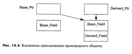 В этом случае семантика другая, так как базовый указатель ссылается на полный производный объект без каких-либо усечений (см. рис. 14.4). При реализации не возникает никаких проблем, потому что мы принимаем, что все указатели представляются одинаково независимо от указуемого типа.