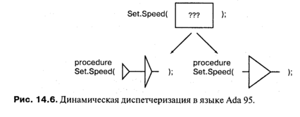Рисунок 14.6 поможет вам понять роль формальных и фактических параметров в диспетчеризации. Вызов Set_Speed вверху рисунка делается с фактическим параметром типа класса. Это означает, что только при вызове подпрограммы мы знаем, имеет ли фактический параметр тип Airplane_Data или SST_Data. Однако каждое обтъявление процедуры, показанное внизу рисунка, имеет формальный параметр конкретного типа. Как показано стрелками, вызов должен быть отправлен в соответствии с типом фактического параметра.