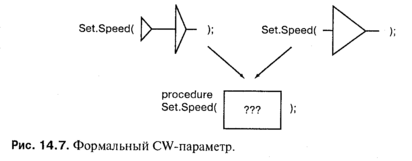 цедуры; формальный параметр имеет тип класса, который соответствует фактическому параметру любого типа, относящегося к классу. Что касается рис. 14.7, то, если бы объявление Set_Speed было задано как: