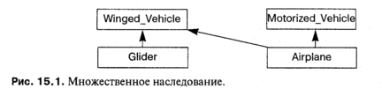 быть многократно порожден из Winged_Vehicle (летательный аппарат с крыльями) и Motorized_Vehicle (летательный аппарат с мотором), в то время как Winged_Vehicle также является (единственным) базовым классом для Glider (планер). Задав два класса: