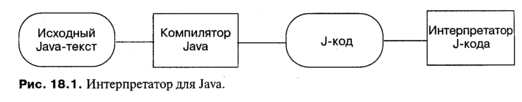 Можно написать компилятор для языка Java точно так же, как и для любого другого процедурного объектно-ориентированного языка. Модель Java, однако, базируется на концепции интерпретатора (см. рис. 3.2, приведенный в измененной форме как рис. 18.1), подобного интерпретаторам для языка Pascal, которые мы обсуждали в разделе 3.10.