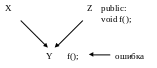 Если бы речь шла об управлении видимостью, то всё было бы «ОК». А тут логически (здравый смысл)- это обращение к функции f(); из класса Z, но компилятору обе функции из X и Z видимы независимо от модификаторв (private, public). Тут компилятор не знает о какой функции идёт речь. Нет ошибки, только если напишем Z::f();. То же самое распространяется и на замещение имён.