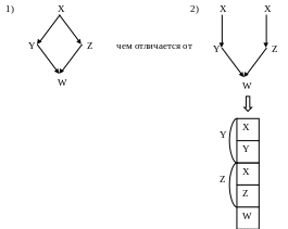 Разница с точки зрения распределения памяти. В первом случае у нас есть только один экземпляр объекта класса Х, а во втором- два. Так же очевидно, что при схеме 1) распределение памяти для Z нелинейное.