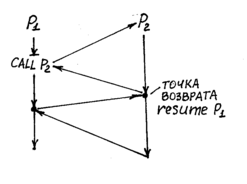 Здесь вызывающая Р1 знает, что вызывает Р2, но не знает куда вернется Р2. Возникает не симметрия механизма call – return : call всегда начинает с первой точки, а return возвращает в точку активации.