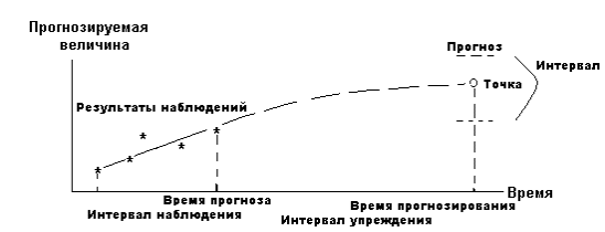 При количественном прогнозировании различают понятия точечного и интервального прогноза . Первое - оценка мат.ожидания прогнозируемого параметра в заданный момент в будущем. Второе - определение размера области попадания будущего значения прогнозируемого процесса с заданной вероятностью попадания.