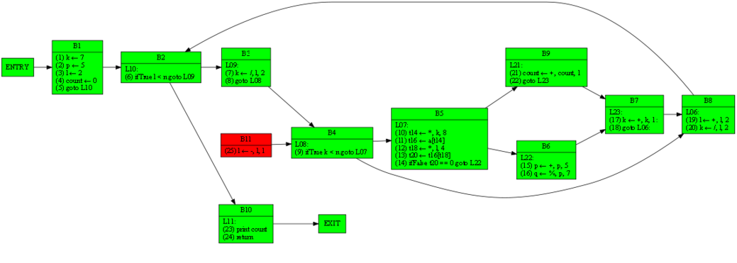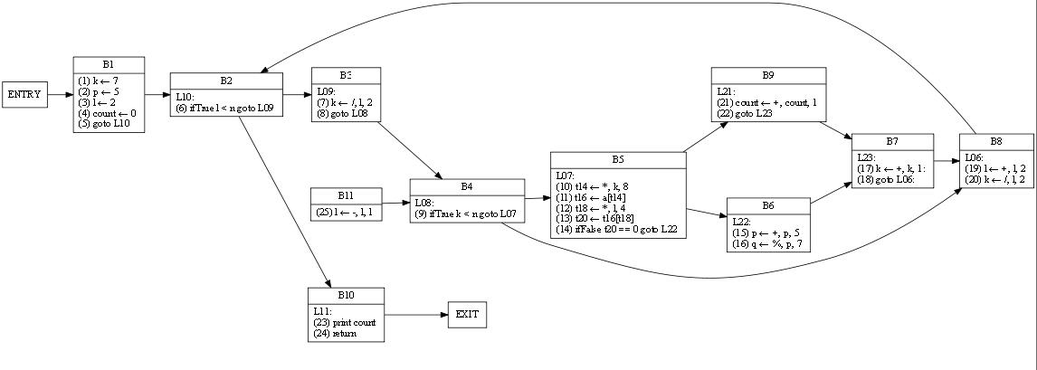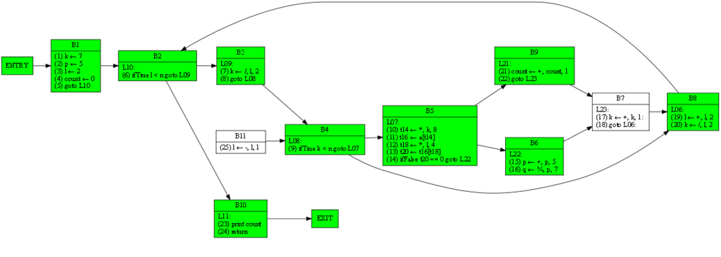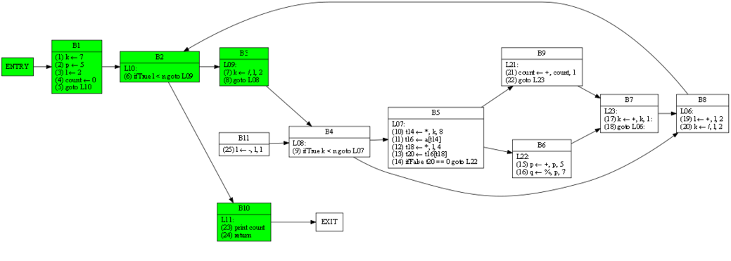 | 10 12 17 19 20 24 25 | 1 3 4 6 7 9 10 11 12 13 14 17 19 20 21 23 24 25 | RDF(B5) = B4(9), def(t16) = 11, def(a) = ∅, def(t14) = 10 | (11) t16 ← a[t14] |