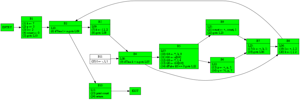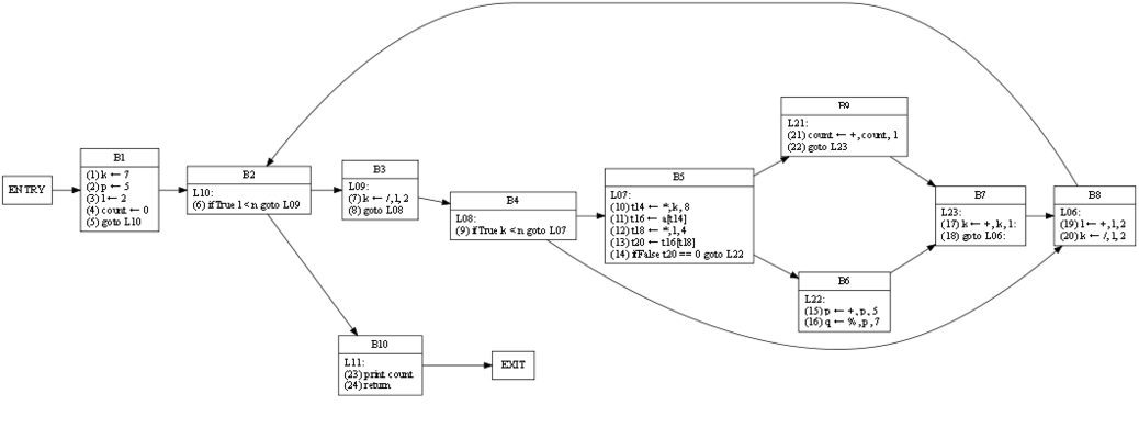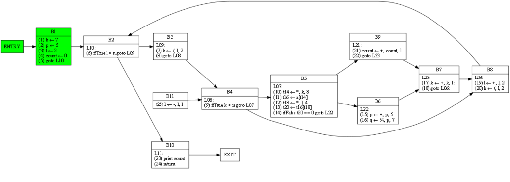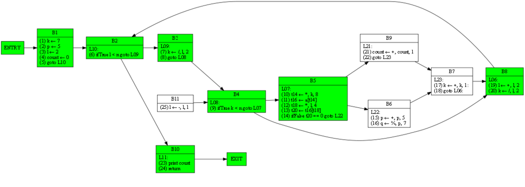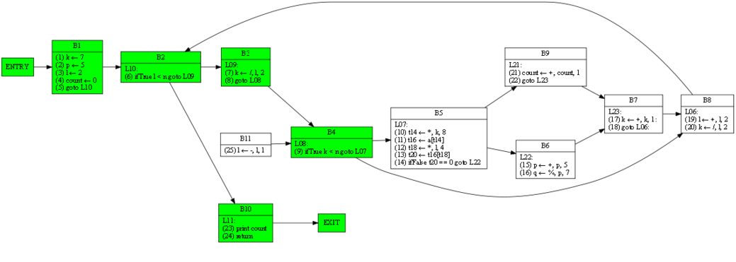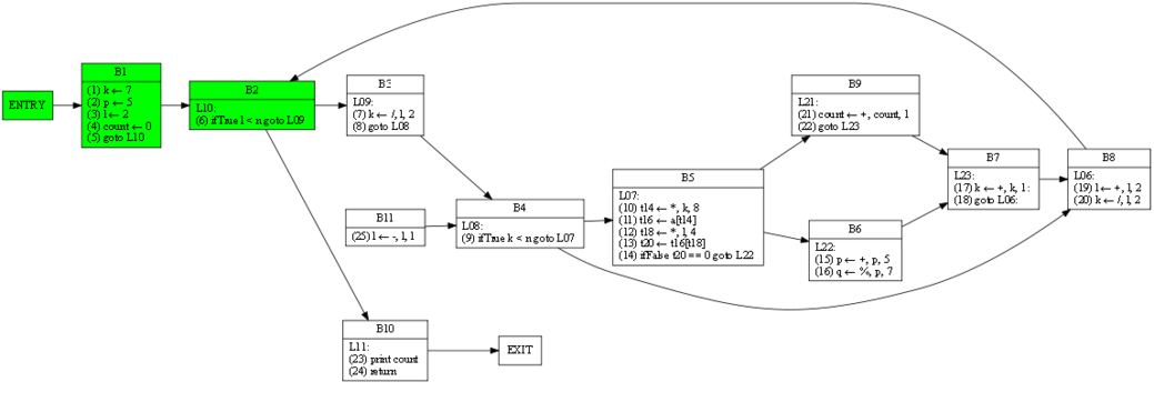 | 1 6 7 13 17 20 24 | 1 4 6 7 9 13 14 17 20 21 23 24 | RDF(B4) = B2(6), def(k) = 1 7 17 20, def(n) = ∅ | (9) ifTrue k < n goto L07 |
