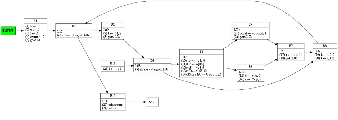 | 3 7 13 17 19 20 24 25 | 1 3 4 6 7 9 13 14 17 19 20 21 23 24 25 | RDF(B2) = B2(6), def(l) = 3 19 25, def(n) = ∅ | (6) ifTrue l < n goto L09 |