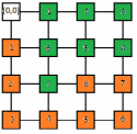 Узел (0,0) рассылает данные. Он имеет 2 исходящих канала. Принимающих узлов 15, значит минимальное количество передач – 8. Этот минимум легко достичь, передавая сообщения по двум конвейерным маршрутам.