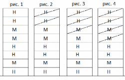 Пусть очередь запросов следующего вида как на рис.1 (рисунки ниже). Н – запрос на немонопольный доступ. М – запрос на монопольный доступ. Координатор посылает права на немонопольный доступ первым двум запросам, удаляет их из очереди, и ждет когда они вернут эти права. В этот момент вид очереди примет вид как в рис. 2. После возвращения прав, координатор посылает право на монопольный доступ следующему запросу и удаляет его из очереди(вид как в рис. 3), после возвращения этого монопольного права, передает монопольное право следующему (вид очереди как в рис. 4). Аналогично следующим двум запросам отправляются права на немонопольный доступ и запросы удаляются из очереди (рис. 5) и т.д. (рис. 6-7).