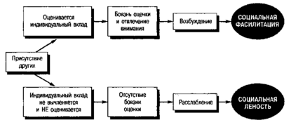 Социальная леность. Социальная фасилитация изучается психологами в условиях, когда есть возможность оценить выполнение задания каждым испытуемым отдельно. Однако нередко люди трудятся коллективно, объединяя свои усилия, и при этом не несут личной ответственности за результаты своего труда: люди нередко работают менее усердно, участвуя в выполнении подобных «аддитивных заданий», чем тогда, когда трудятся в одиночку. Т.о, отсутствие индивидуальной ответственности за результаты труда создает благоприятную почву для проявлений социальной лености.