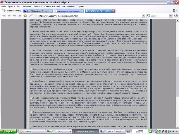 поведение: сниженный соц контроль, высокая частота коммуникаций, психоэмоциональные перегрузки, развитие массовых психических феноменов (феномен заражения, мода), большие непродуктивные временнные затраты (дорога), выше уровень преступности, загрязнения среды как кактализатор некоторых психических процессов.