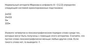 Нормальный алгоритм Маркова в алфавите А ={1,2,3} определён следующей системой ориентированных подстановок: Укажите четвёртое в лексикографическом порядке слово среди тех, которые могут быть получены с помощью этого алгоритма. Считайте, что пустое слово лексикографически меньше любых других слов. Если такого слова нет, то выведите -1.