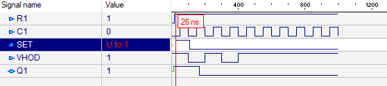 Моделирование показало, что задержка на элементе И и триггере равна 26 нс.