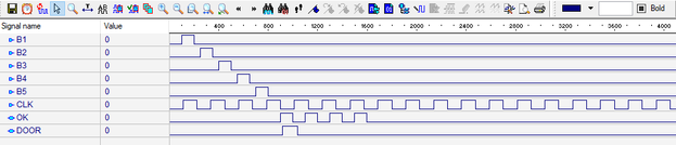 Набор кода осуществляется импульсами на входах B1-B5. Набор заполняет сдвиговый регистр, созданный на основе цепочки триггеров ТМ2. Код уставки хранится в регистре ИР23. Сравнение осуществляется при помощи схемы сравнения на логических элементах И. Количество неверных попыток считается счетчиком ИЕ7, при получении трех неверных попыток кнопка ОК блокируется, а второй счетчик отсчитывает 8 тактов (для примера. Можно использовать делители частоты или счетчики большей разрядности). После этого счетчики сбрасываются.