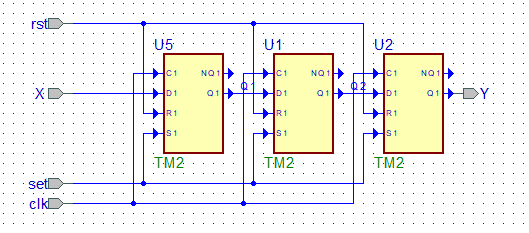 Построить схему трехразрядного регистра сдвига( входные сигналы-clk,rst,x, выходной сигнал-Y )и исследовать его работу моделированием. Определить максимальную тактовую частоту и задержку выхода относительно активного фронта тактового сигнала