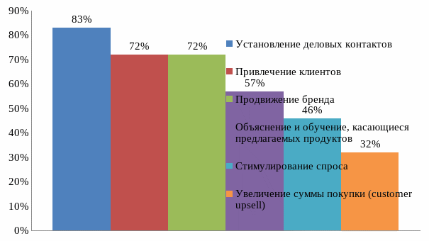 На B2B рынке выставка является одним из основных маркетинговых инструментов, применяемых компаниями для достижения стратегических целей. При этом согласно проведенным исследованиям, B2B мероприятия, организованные сторонними компаниями, приносят более высокие результаты, нежели мероприятия, организованные самостоятельно. В Диаграмме 1 отражены результаты опроса участников B2B рынка о том, какие цели они ставят при проведении B2B мероприятия.58