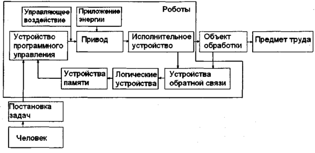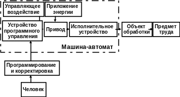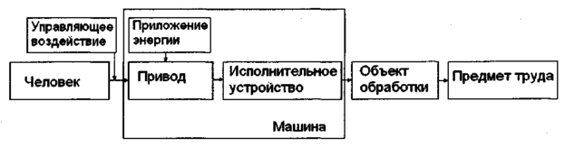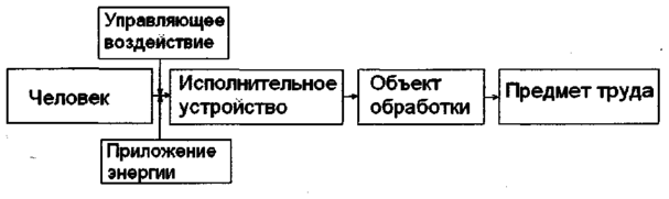 Механизированное производство - изобретение различных двигательных машин (паровых, электрических). На том этапе машинного производства, человек осуществляет управляющее воздействие на органы управления машины и средств механизации технологического процесса. Поступающая энергия, с помощью привода и исполнительного устройства воздействует на объект обработки для получения предмета труда.