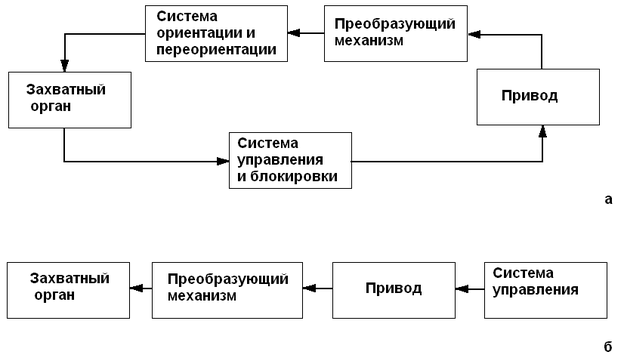 Характерной особенностью структурной схемы (рис.а) является ее замкнутое строение, т. е. наличие взаимосвязи между всеми механизмами, осуществляемой через систему управления и блокировки. Наличие взаимосвязи между работой привода и исполнительного (захватного органа) механизма является обязательным условием для средств автоматизации. Для каждой конкретной конструкции средств автоматизации структурная схема может отличаться от обобщенной, показанной на рис. а (т. е. некоторые элементы могут отсутствовать); однако в любом случае она будет состоять из элементов, показанных на рис. 6, а.