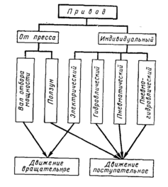 Привод средств автоматизации должен обеспечивать требуемые движения захватного органа с деталью и без нее. В средствах автоматизации используются разнообразные приводы, классификация которых дана на рис. 1. Из классификации следует, что средства автоматизации, применяемые в кузнечно-штамповочном производстве, бывают с индивидуальным приводом или с приводом от пресса (от главного вала или ползуна), т. е. не имеют самостоятельного привода.