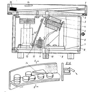 На рис. 3 (22) показан в бункер, где в качестве приводного элемента применяются электромагниты, питающиеся постоянным пульсирующим электрическим током, под действием которого катушка электромагнита попеременно притягивает и отпускает сердечник, вызывая вибрации. В результате этого заготовки начинают перемещаться в нужном направлении.