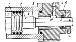 Буферное устройство работает следующим образом. В полости II поддерживается рабочее давление; в полостях 1 и III — давление сливной магистрали. По мере движения поршня 1 шток 2 заходит во втулку 4, смонтированную в крышке 5. Сопряжение втулки 4 со штоком 2 поршня выполнено по посадке, поэтому выход жидкости из полости 1 происходит через отверстия З в штоке 2 поршня. Так как сечение отверстия З небольшое, то в полости 1 постепенно повышается давление, т. е. увеличивается сила сопротивления движению поршня; при этом поршень плавно останавливается. Изменяя длину штока 2 и площадь сечения отверстий З, можно получить оптимальные скорости при останавливании поршня. При движении поршня влево обеспечивается плавное нарастание скорости, так как давление в полости II действует в начальный период на небольшую кольцевую площадь штока. Применение буферного устройства возможно лишь в том случае, когда в начале движения требуются меньшие усилия, чем в процессе работы. Если на протяжении всего хода необходимо полное рабочее усилие, то в крышке 5 между полостями I и I устанавливается обратный клапан, пропускающий жидкость только в направлении полости 1.