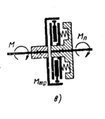 На рис. 64, в показана принципиальная схема фрикционного механизма периодического движения. Эта схема является универсальной, так как может обеспечивать любые соотношения между периодом выстраивания и движения. Выстраивание механизма обеспечивается проскальзыванием, возникающим при условии, что момент сопротивления М становится больше момента Мтр развиваемого постоянно замкнутым фрикционным механизмом, т. е.