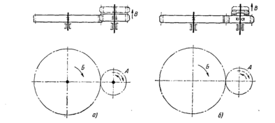 На рис. 4(63) приведены две наиболее распространенные схемы, обеспечивающие периодичность движения за счет прерывания кинематической связи. В обоих случаях в период вращения малой шестерни по часовой стрелке (см. штриховую стрелку А) одностороннее движение колеса (стрелка Б) обеспечивается за счет выдвижения шестерни (рис. 63, а) или ведущей полумуфты (рис. 63, 6) в направлении В.