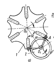 На рис.5, а показан механизм мальтийского креста (цевочный механизм), который обеспечивает выстраивание ведомой части (креста 1) при постоянно вращающейся ведущей части (цевки 2) за счет западания хвостовика цевки в паз креста. Расчетный угол