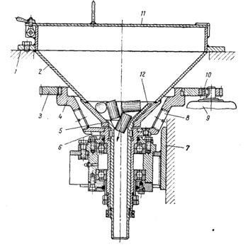 Бункерное устройство с вращающейся втулкой показано на рис. 11. В неподвижный корпус 2, который крепится к основанию фланцем 1, загружаются заготовки. После этого бункер закрывается крышкой 11. В нижней части бункера вращается лопасть 12, которая изготовлена как одно целое с приемным лотком (трубкой) 5. Трубка 5 соединена со ступицей 6, вращающейся в подшипниках качения, смонтированных в основании 7. Вращение трубки 5 (10 об/мин) осуществляется от электродвигателя 9 через открытую зубчатую передачу 10 и З и ступицы 4 и б. Заготовки, находящиеся в бункере, благодаря вращению лопасти 12 разворачиваются и одна за другой попадают в трубку 5, которая в зависимости от диаметра заготовок может быть сменной. Во время работы бункера в ступице 4 накапливается пыль, удаляемая сжатым воздухом через отверстия, закрытые пробками 8.