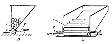 В кассетных магазинных устройствах за готовки укладываются в один ряд и располагаются друг над другом (рис. 2, а и б), в лотковых - друг за другом (рис. 2, в). В штабельных ориентирующих устройствах заготовки укладываются в несколько рядов. Изделия выдаются поперек (рис. 2, г) или вдоль (рис. 2, д) оси. Штабельные устройства применяются главным образом для стержневых изделий, т. е. для заготовок с большим отношением длины к диаметру (толщине). Выдача заготовок из магазинных ориентирующих устройств обеспечивается подающим или питающим устройством.